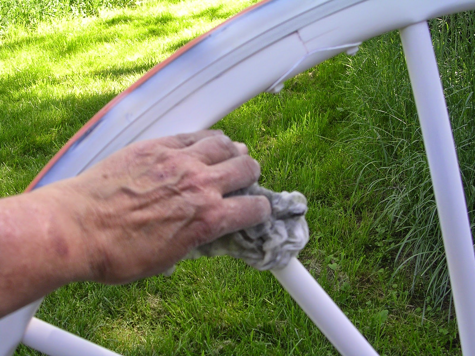After removing 99% of the paint from the wheels, applying a coat of sealer and two coats of primer, I have red pigment blushing through the white primer! I have not inspected the third coat yet, but I'm hoping that after a few weeks drying time between coats #2 and 3, the pigment may have bound with the second coat. I am worried that I will get some bleed through in my final, pale yellow paint, and I'm not entirely sure what to do about it. There is still time, if anybody has a suggestion.